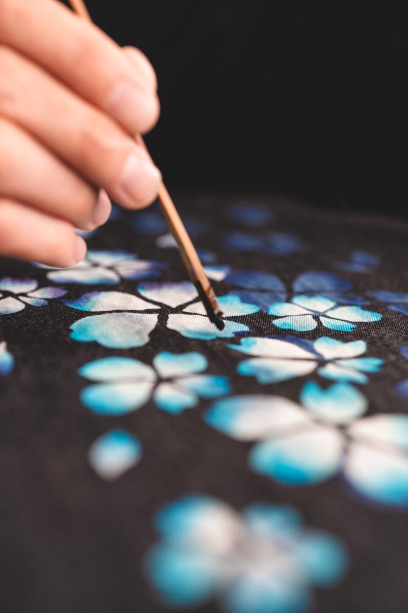 As a kimono gets older, its value may increase as an antique. Among modern clothing, denim is a material that also increases in value over time. In other words, we apply traditional hand-painted Kyoto Yuzen dyeing to denim with the desire to pass on the culture by applying traditional hand-painted Kyoto Yuzen dyeing to materials that have the same value. In addition, there is another reason. The world is rapidly changing. For example, when it comes to vehicles, we now have horses, carriages, and cars. Kimono is clothing from the era when people rode horses. Currently, the vehicle is a car.