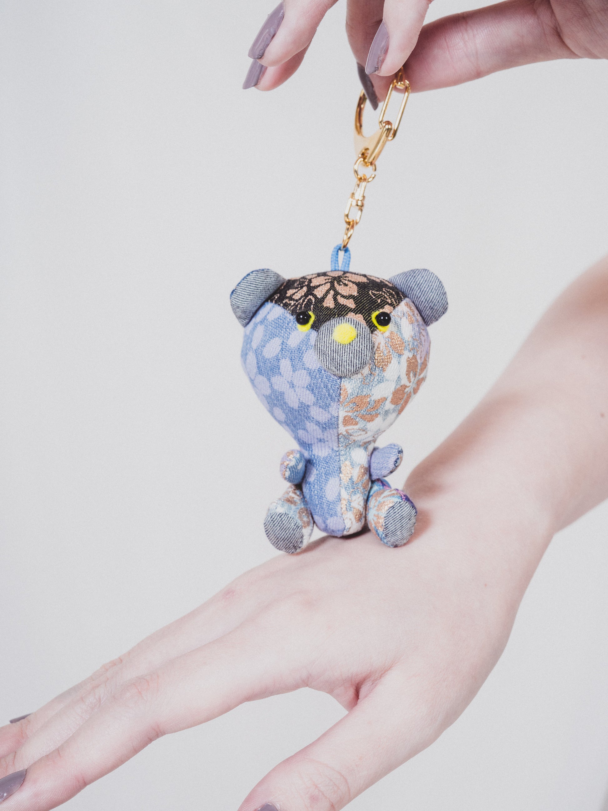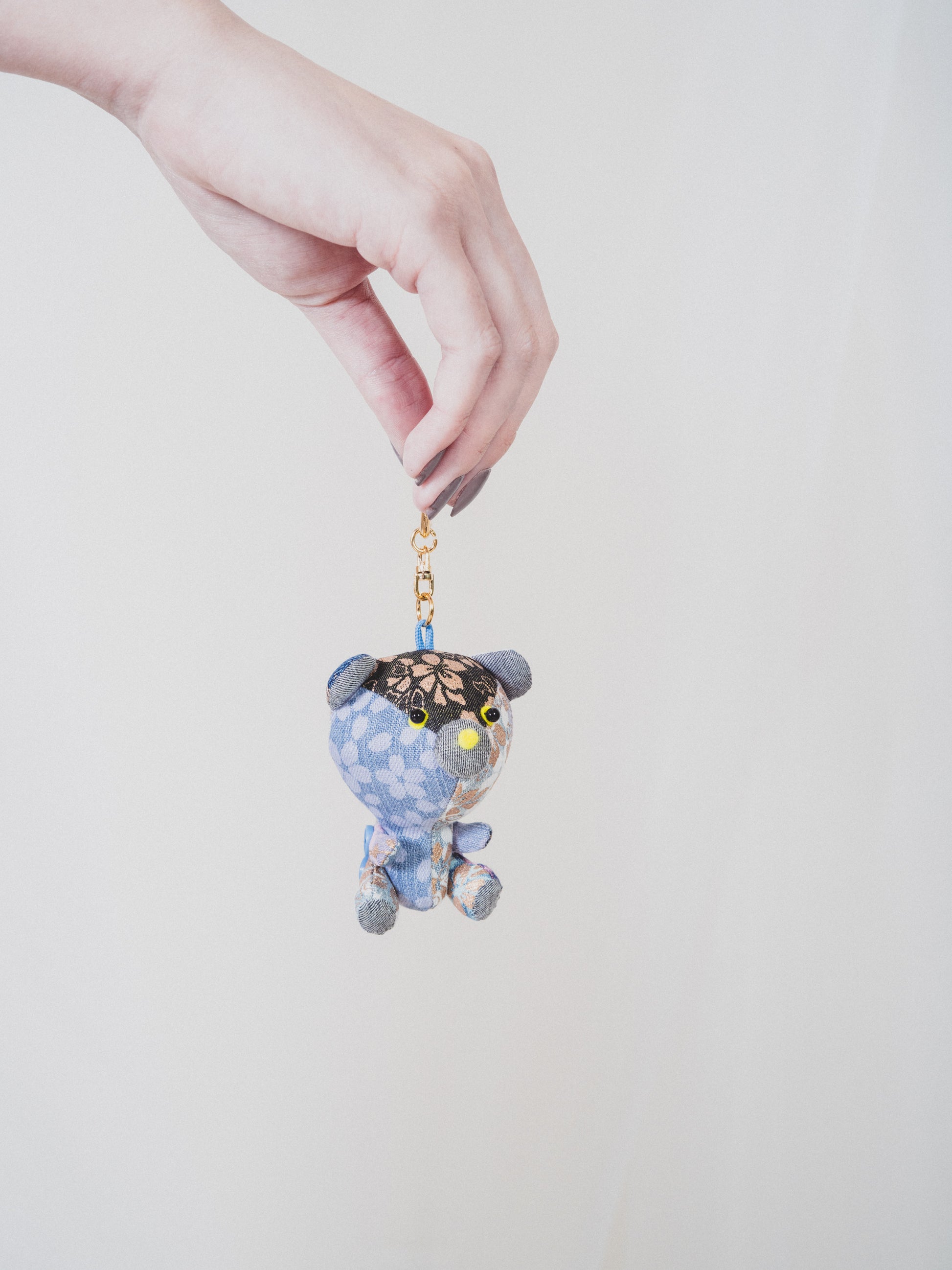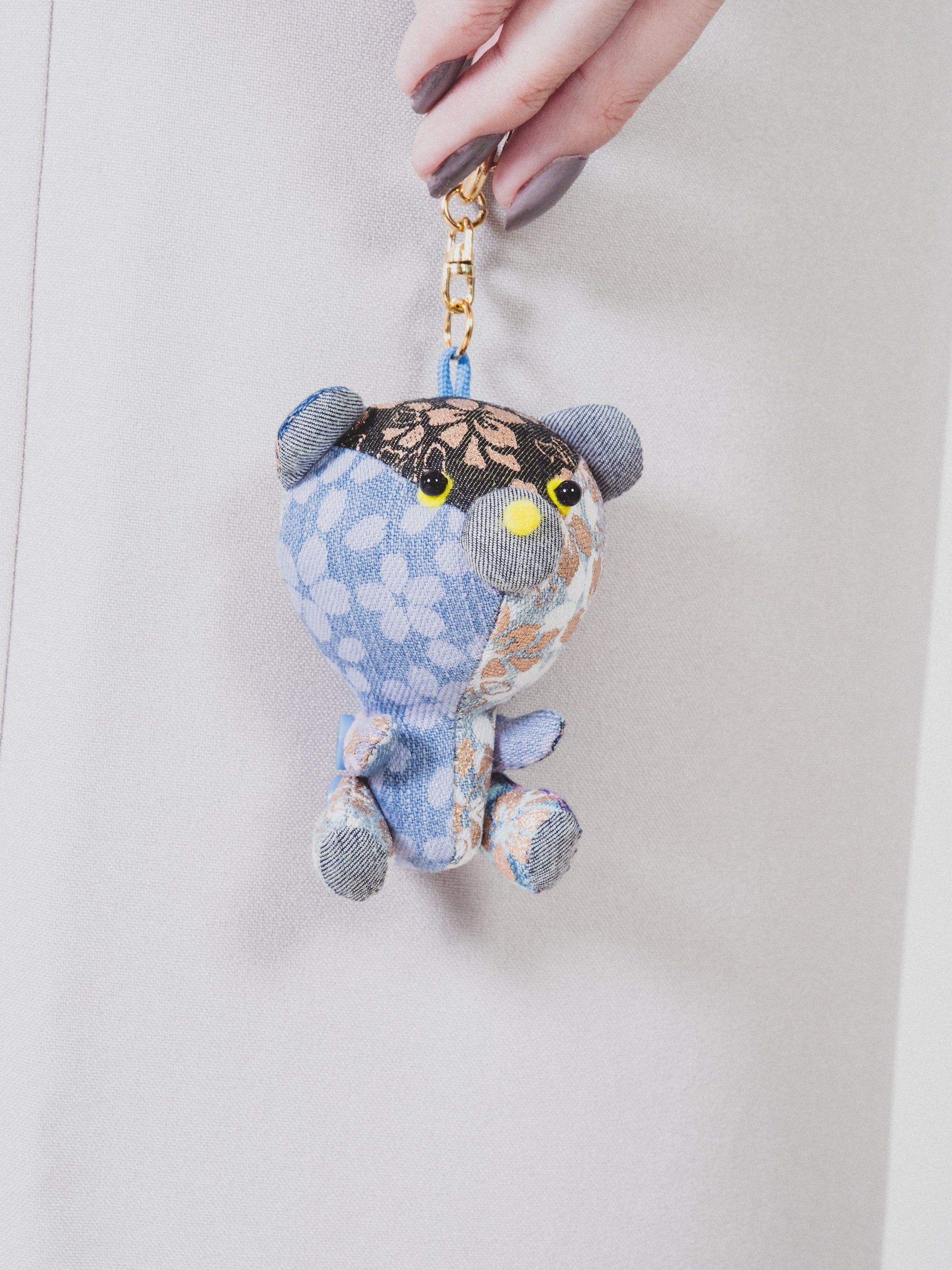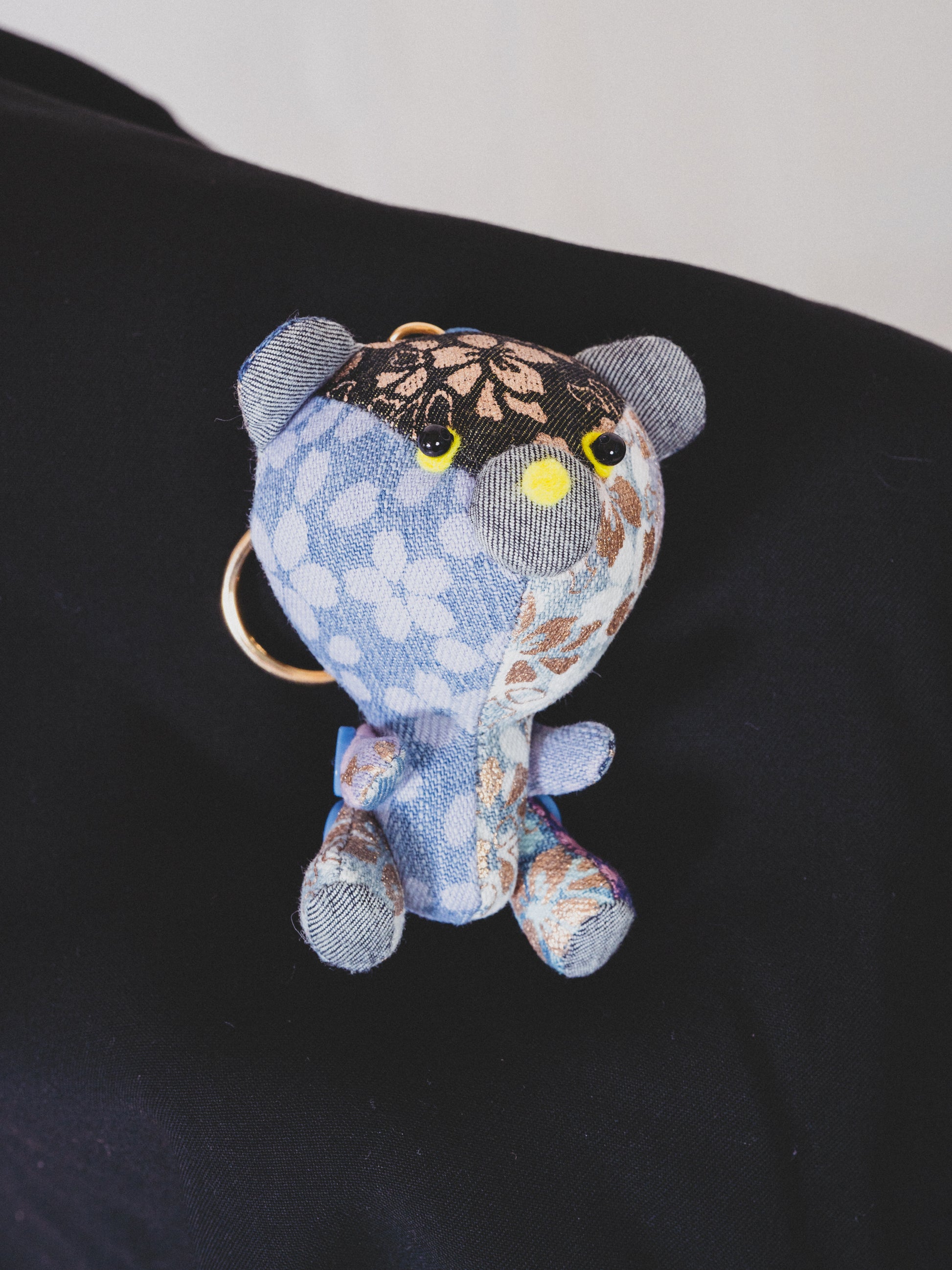 着物に使用される伝統工芸の技術で加工したデニム生地で(浸染で染めたり、柄を重ねて染めたり、金彩で柄を入れたり)様々な染色技法を使って制作したデニムのぬいぐるみです