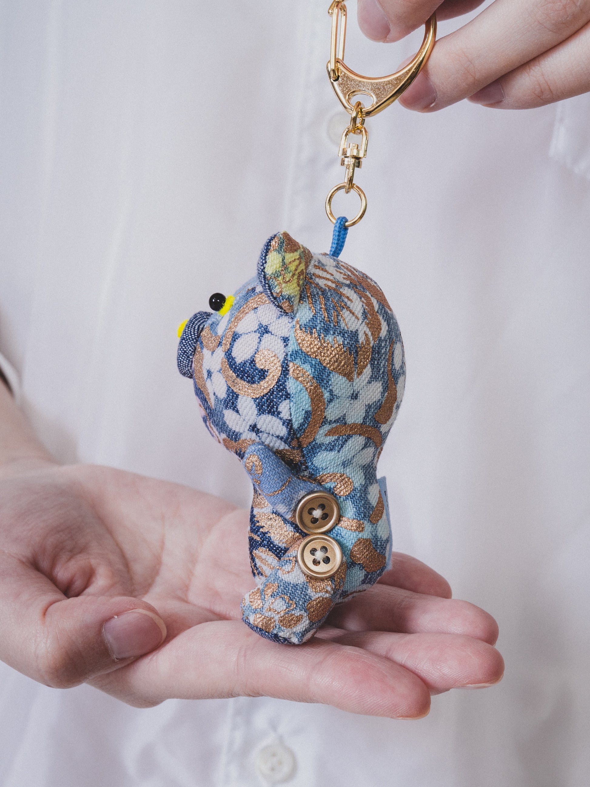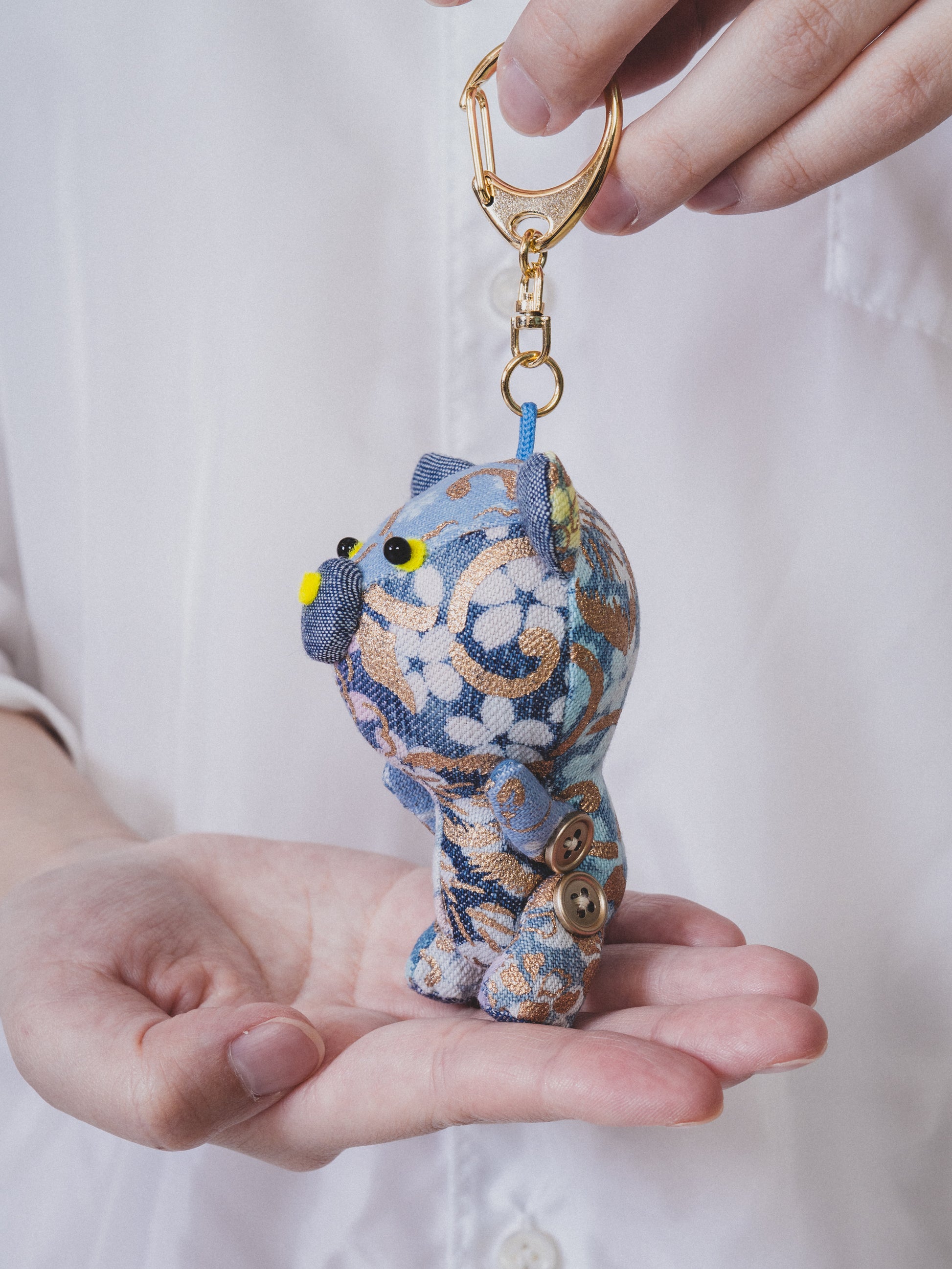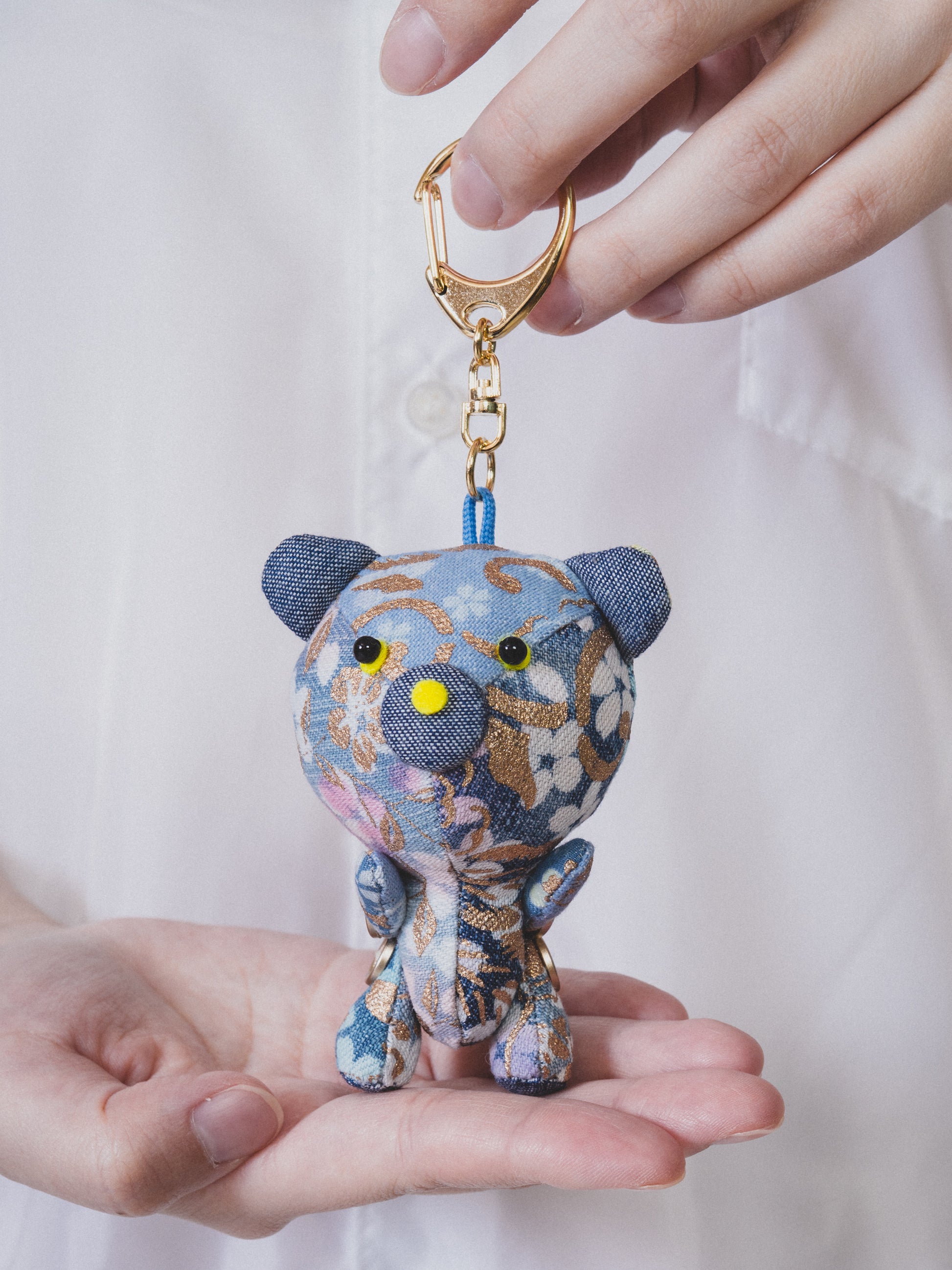 着物に使用される伝統工芸の技術で加工したデニム生地で(浸染で染めたり、柄を重ねて染めたり、金彩で柄を入れたり)様々な染色技法を使って制作したデニムのぬいぐるみです
