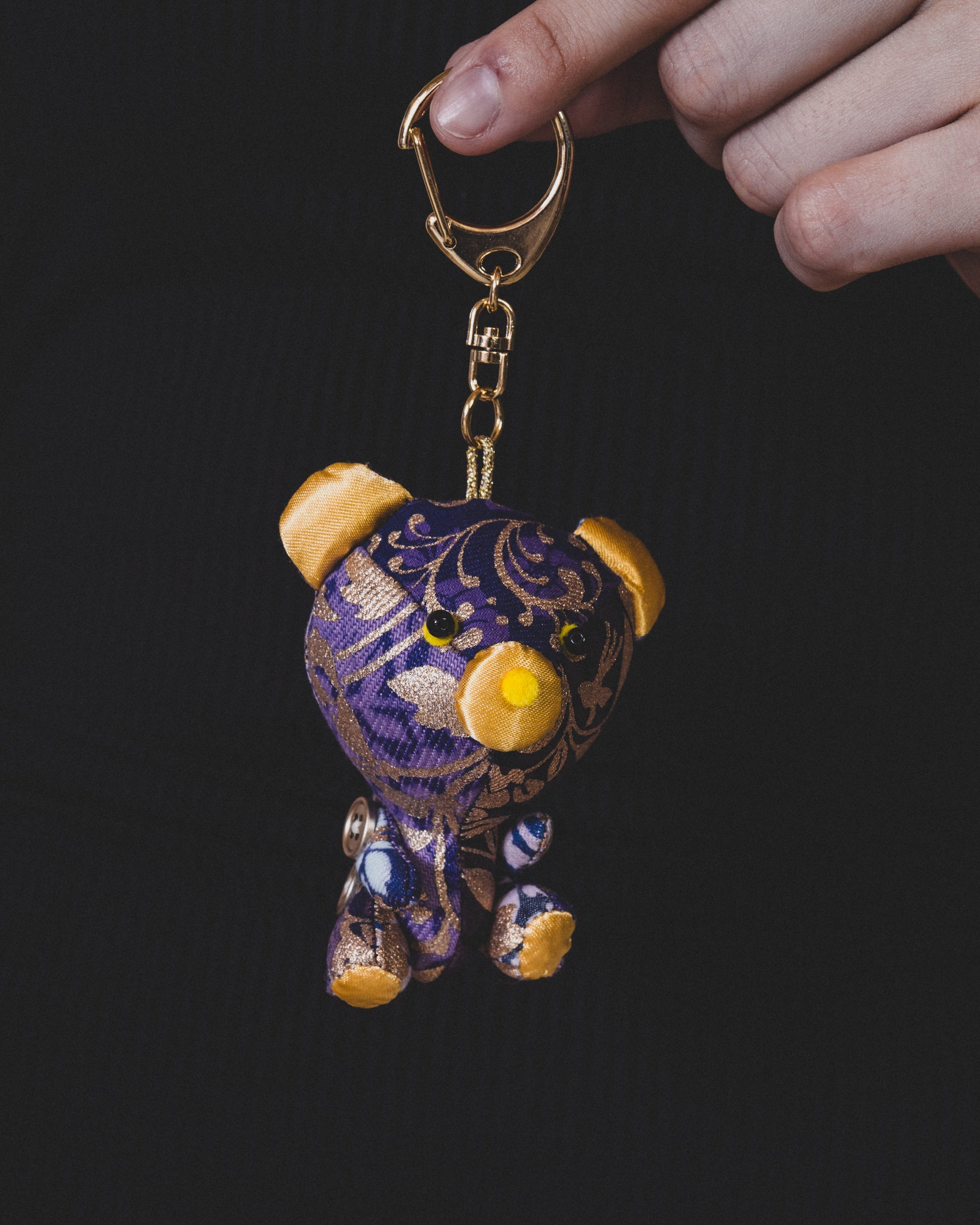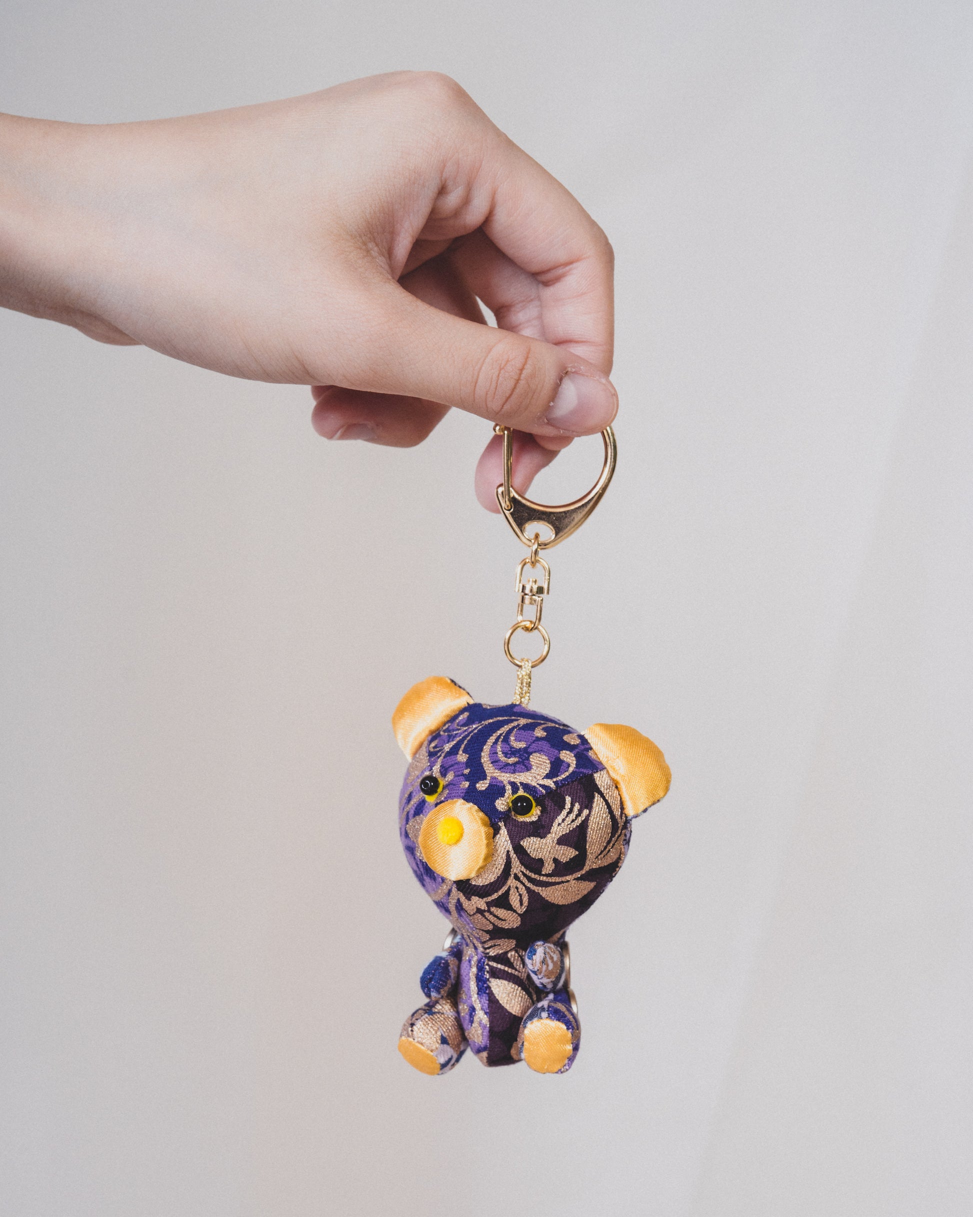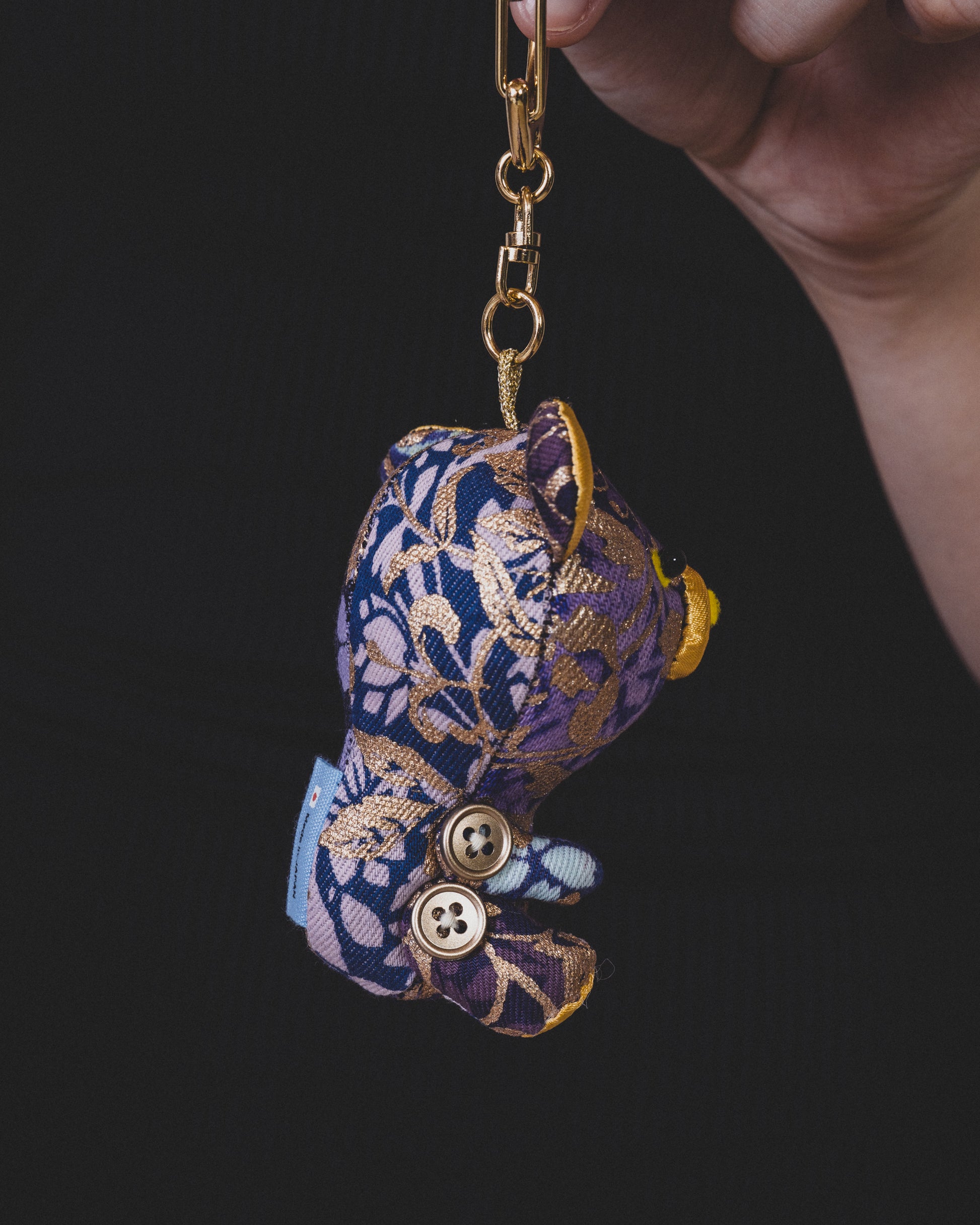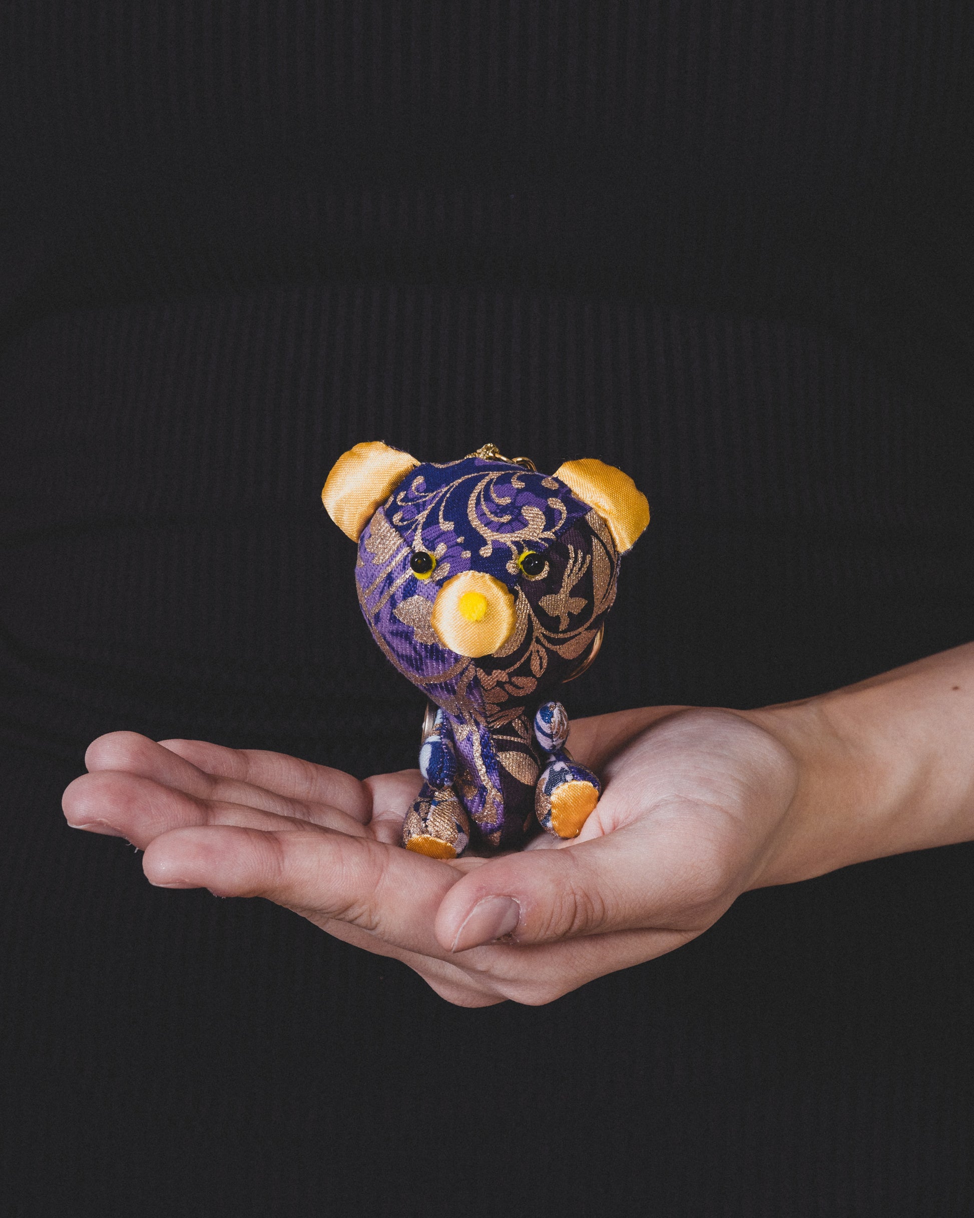 着物に使用される伝統工芸の技術で加工したデニム生地で(浸染で染めたり、柄を重ねて染めたり、金彩で柄を入れたり)様々な染色技法を使って制作したデニムのぬいぐるみです