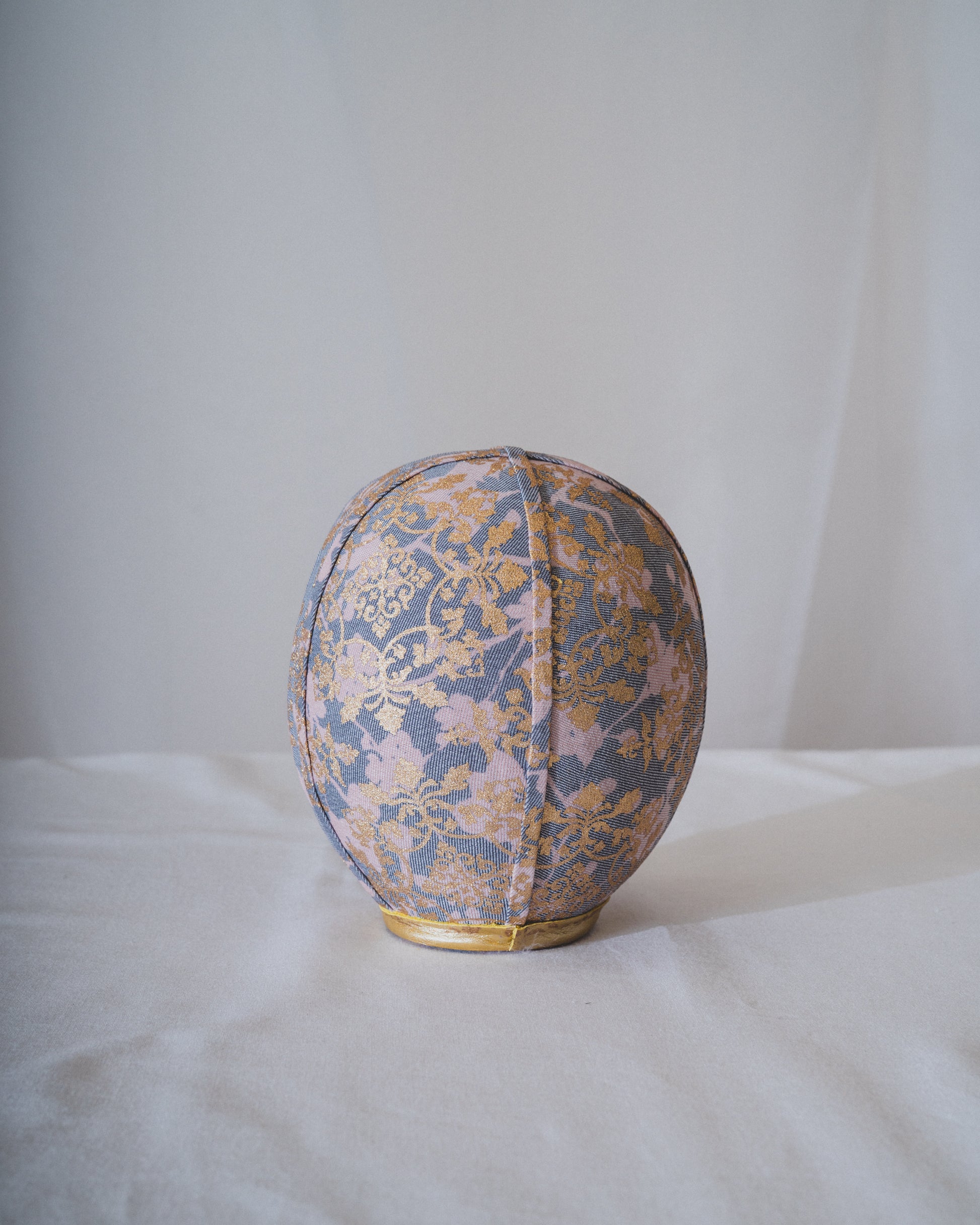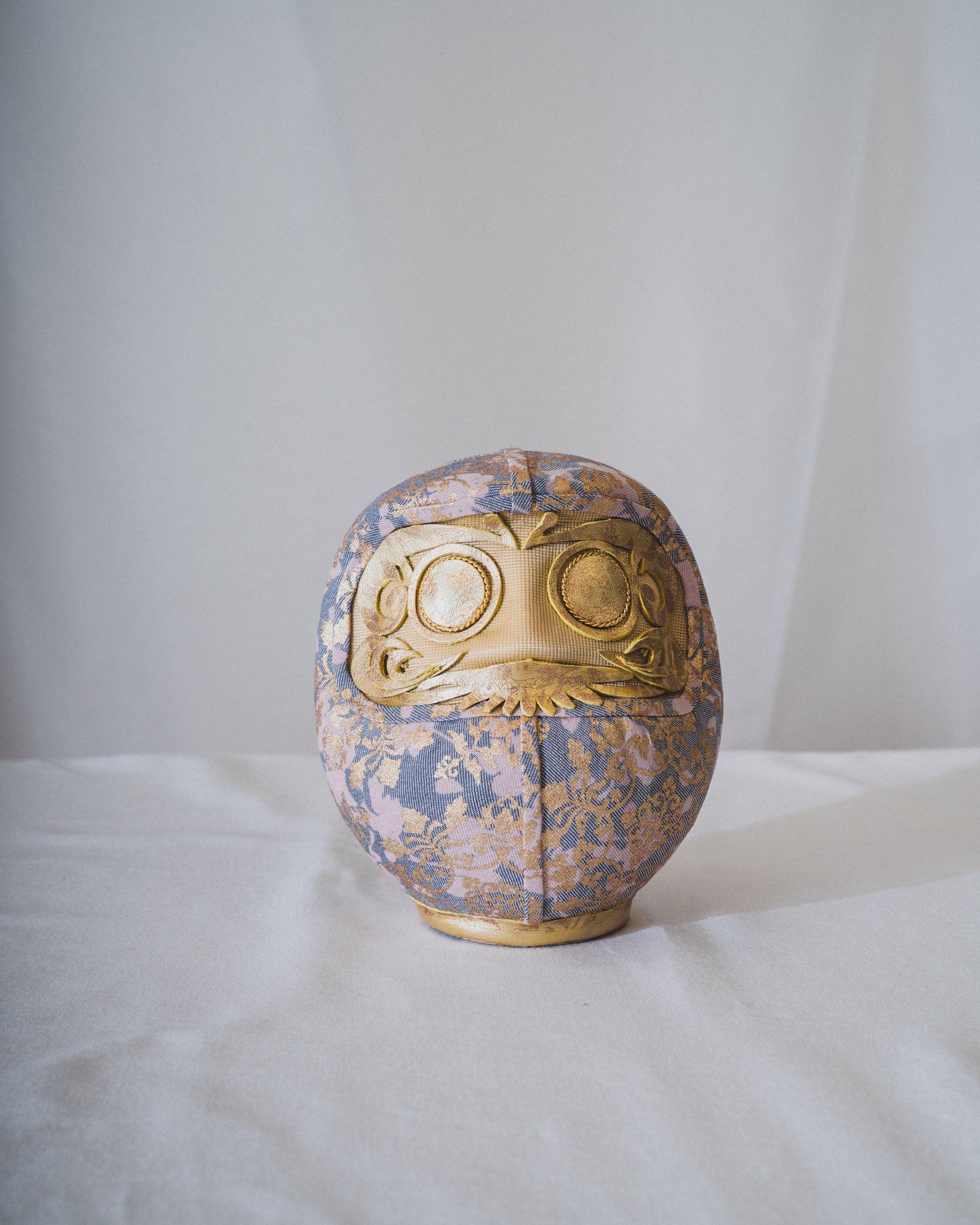 Kinsai Yuzen Technique: The Daruma form is layered with the dyeing and gold leaf application techniques of Kinsai Yuzen (gold-decorated Yuzen dyeing), a method used for kimono. This bridges the rich culture of Kyoto dyeing and gold artistry with the contemporary material of denim.
