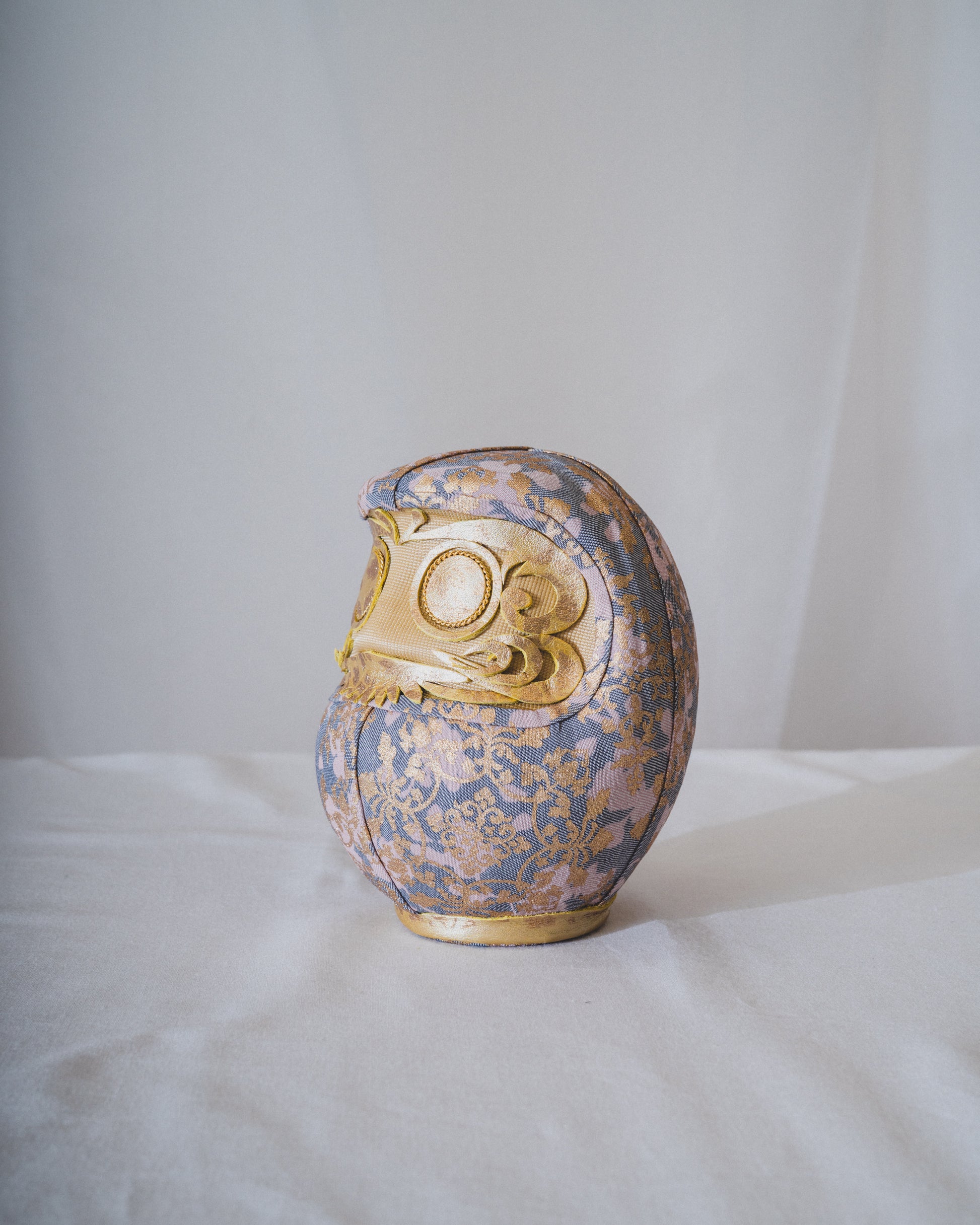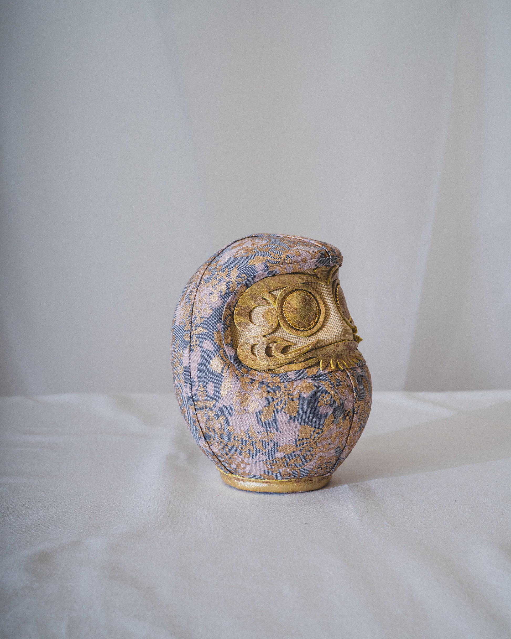 - 金彩友禅の技術: だるまのフォルムには、着物にも用いられる金彩友禅(Kinsai Yuzen)の染色・金彩技術が重ねられており、京都の染めと金彩の文化を現代素材であるデニムへと橋渡ししています。