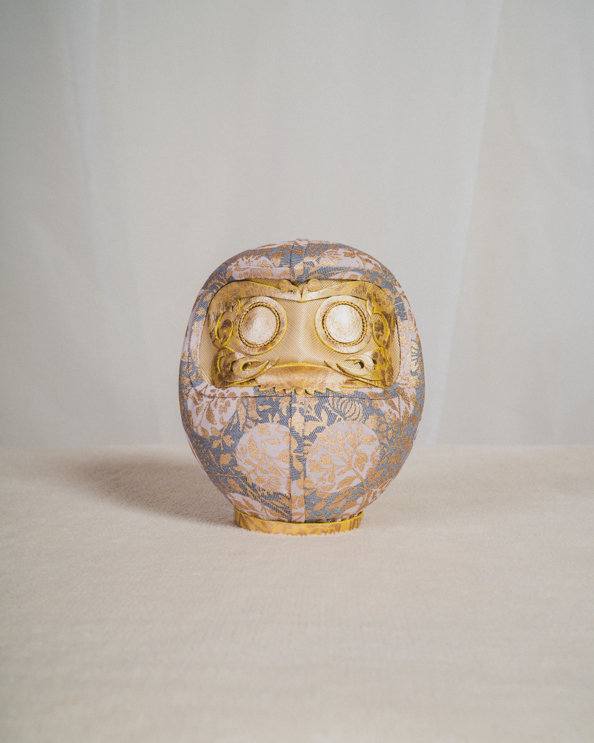KYOTO DENIM explores new forms of expression by applying Kyoto’s 300-year-old kimono dyeing techniques to the modern medium of denim. For this piece, the Daruma’s form is wrapped in denim treated with Kinsai Yuzen (gold-leaf application and dyeing). This bridges the ancient culture of Kyoto’s dyeing and gold-leaf artistry with contemporary lifestyles.