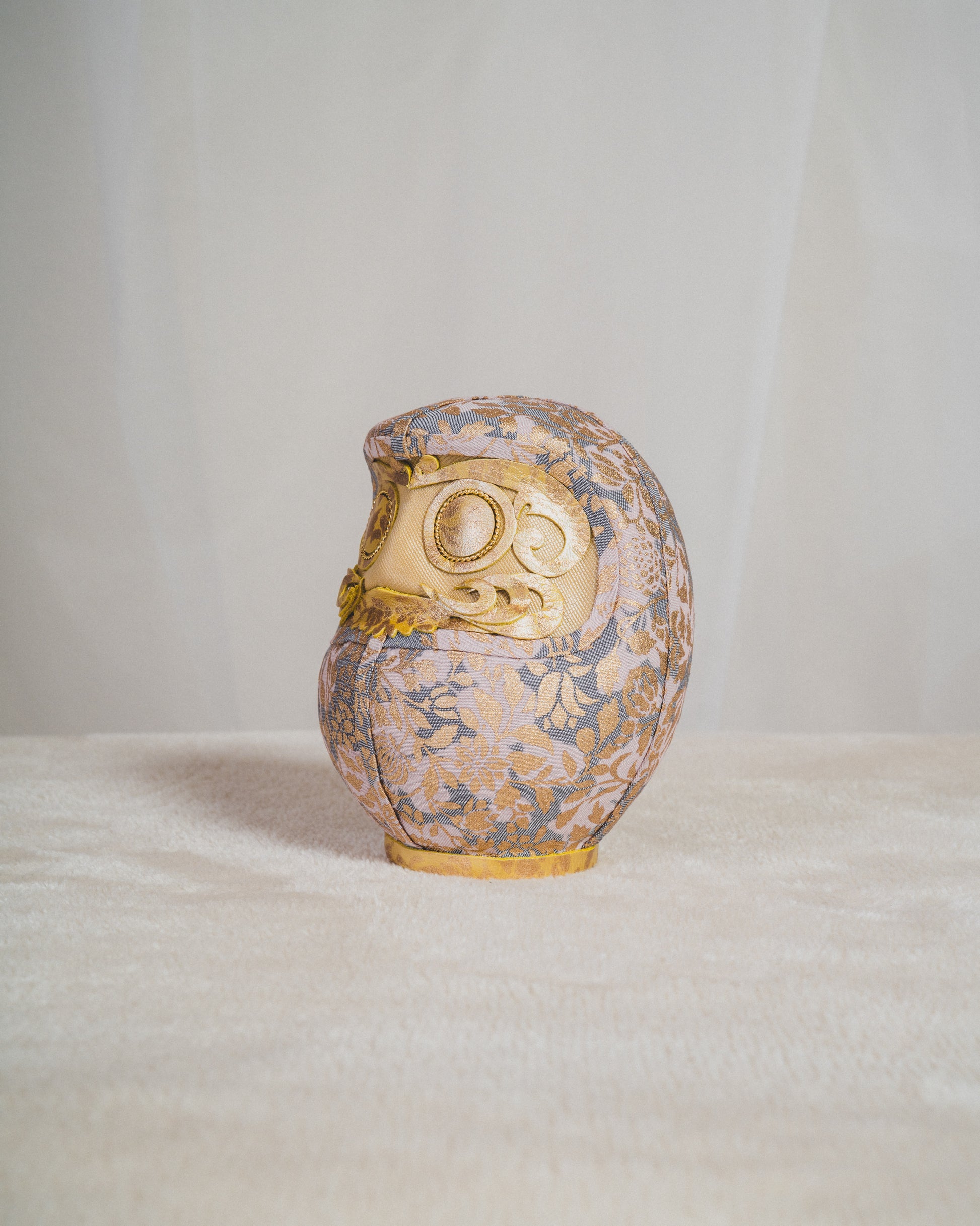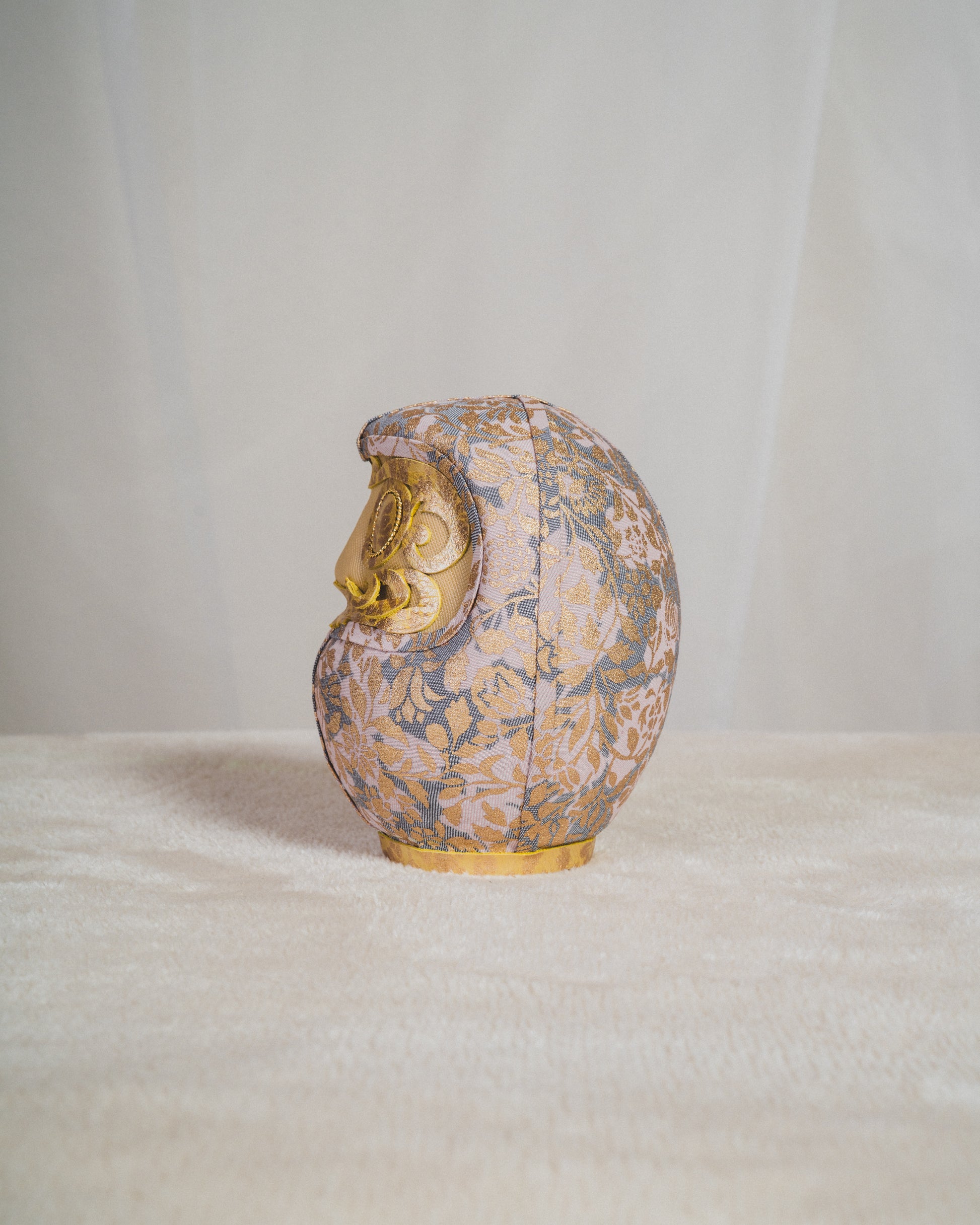 KYOTO DENIM explores new forms of expression by applying Kyoto’s 300-year-old kimono dyeing techniques to the modern medium of denim. For this piece, the Daruma’s form is wrapped in denim treated with Kinsai Yuzen (gold-leaf application and dyeing). This bridges the ancient culture of Kyoto’s dyeing and gold-leaf artistry with contemporary lifestyles.