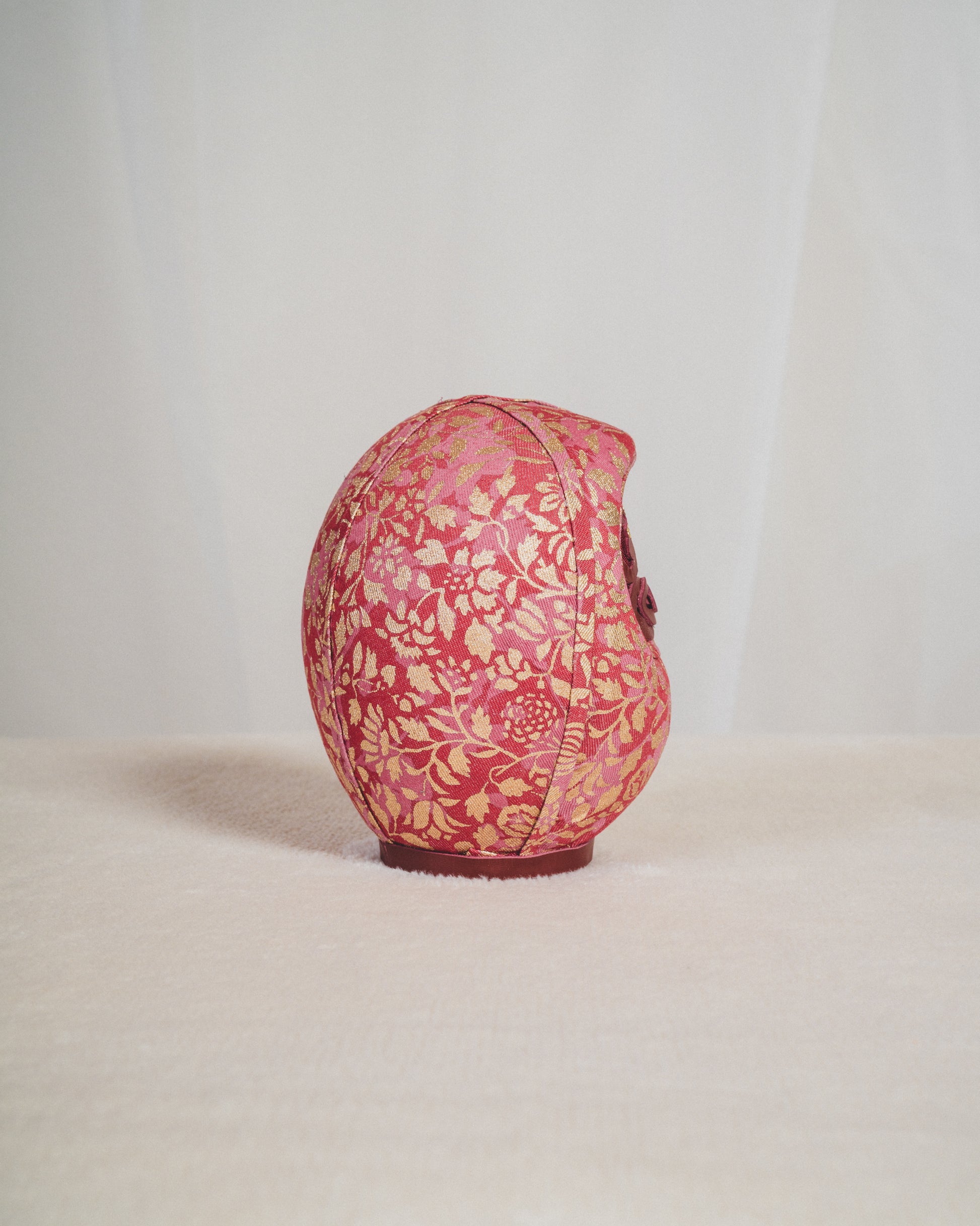 KYOTO DENIMは、着物に用いられてきた 300年以上の歴史を持つ京都の染色技術 を、デニムという現代素材に重ねることで、新たな表現を探求してきました。本作では、だるまのフォルムに金彩友禅(Kinsai Yuzen) の染色・金彩技法を施したデニム生地を使用していま。、京都の染めと金彩の文化を、現代のライフスタイルへと橋渡ししています。