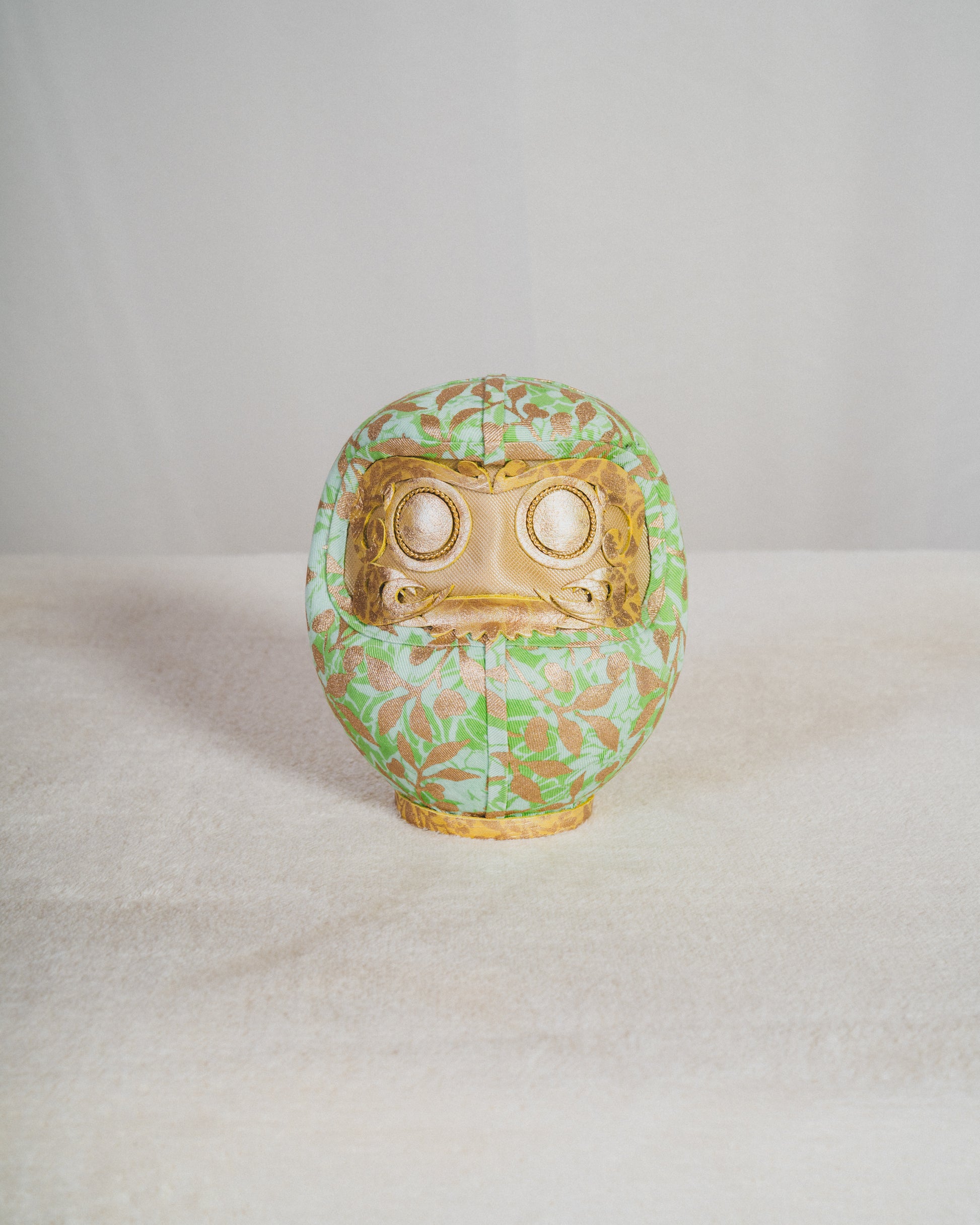 KYOTO DENIM explores new forms of expression by applying Kyoto’s 300-year-old kimono dyeing techniques to the modern medium of denim. For this piece, the Daruma’s form is wrapped in denim treated with Kinsai Yuzen (gold-leaf application and dyeing). This bridges the ancient culture of Kyoto’s dyeing and gold-leaf artistry with contemporary lifestyles.