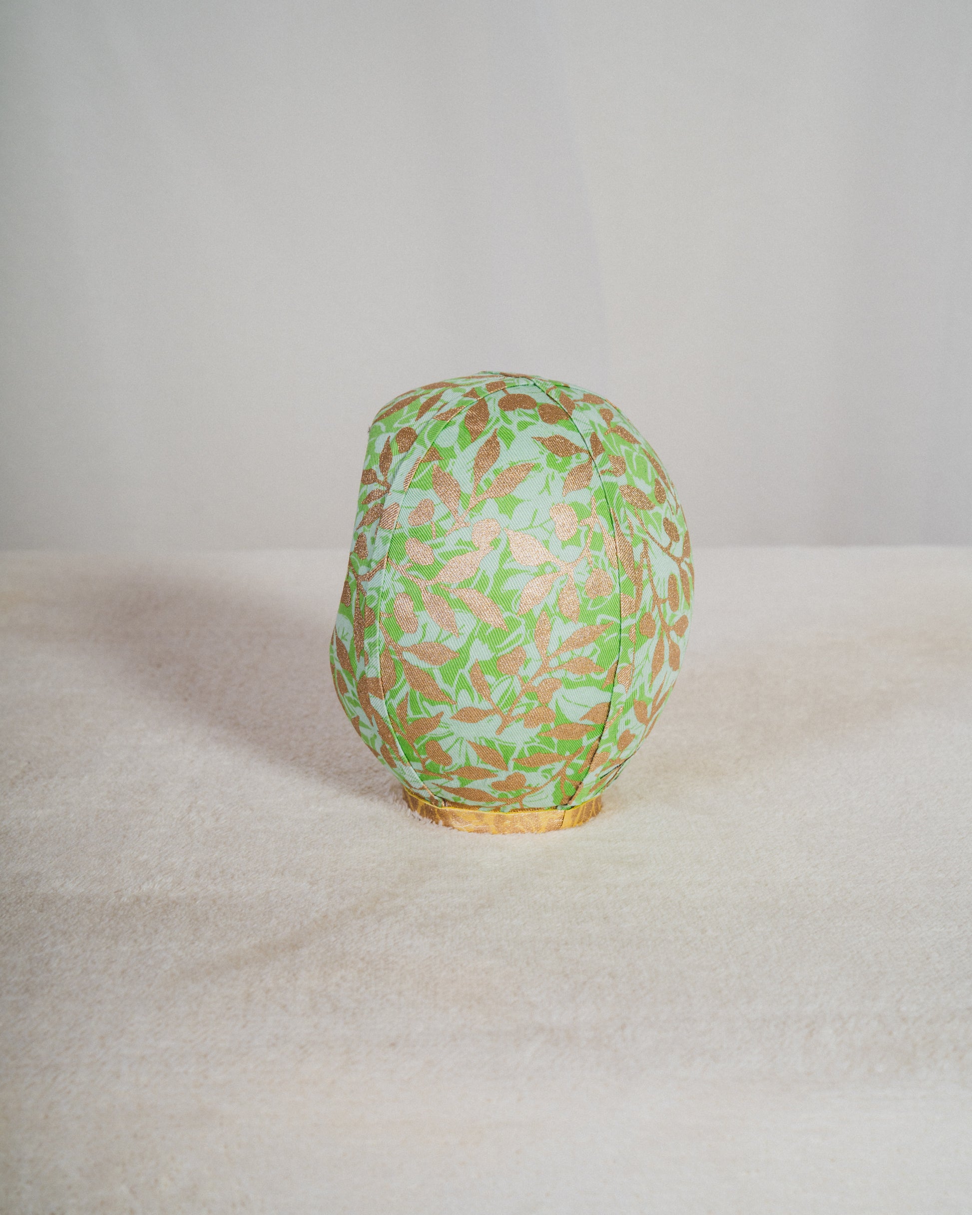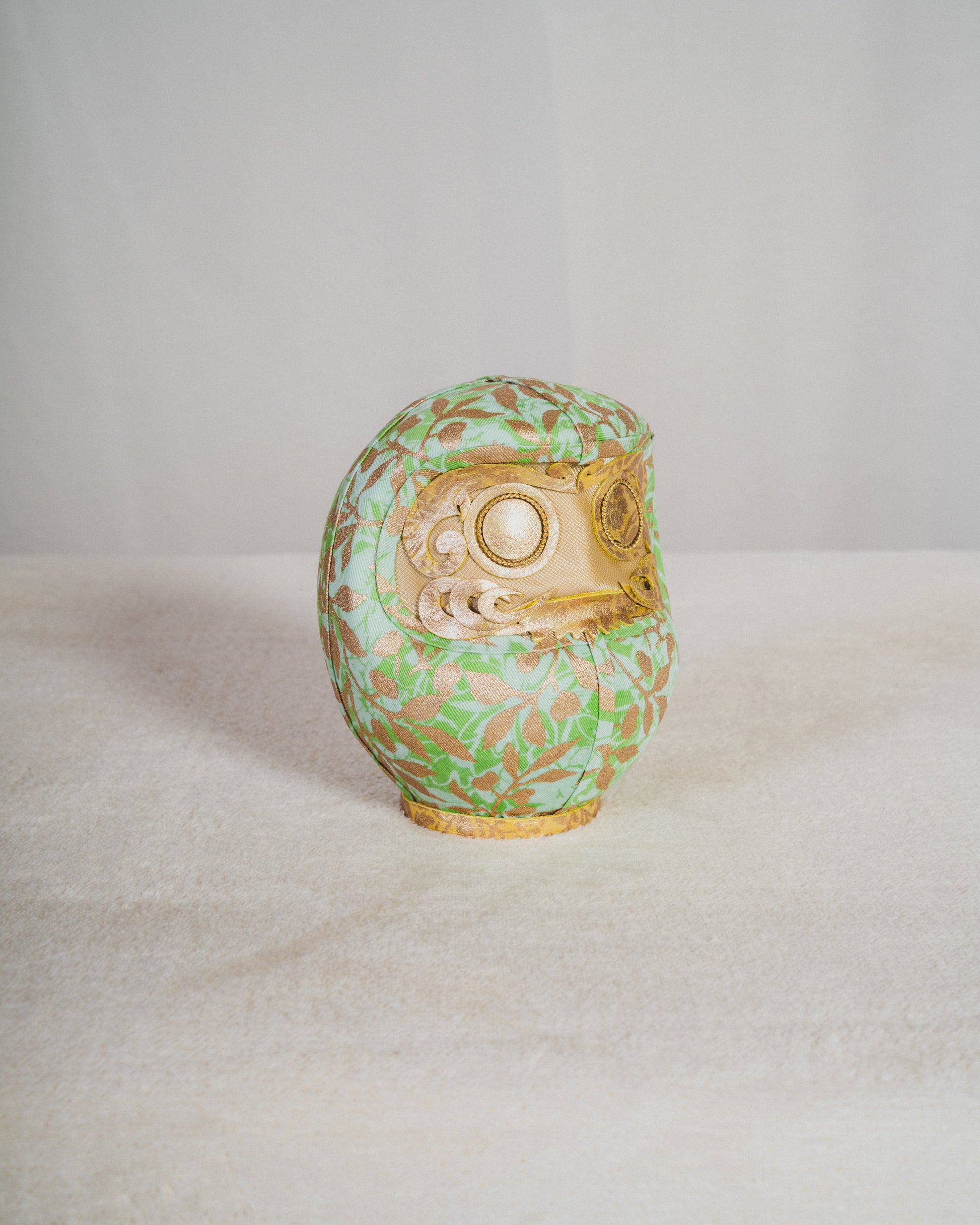KYOTO DENIMは、着物に用いられてきた 300年以上の歴史を持つ京都の染色技術 を、デニムという現代素材に重ねることで、新たな表現を探求してきました。本作では、だるまのフォルムに金彩友禅(Kinsai Yuzen) の染色・金彩技法を施したデニム生地を使用していま。、京都の染めと金彩の文化を、現代のライフスタイルへと橋渡ししています。