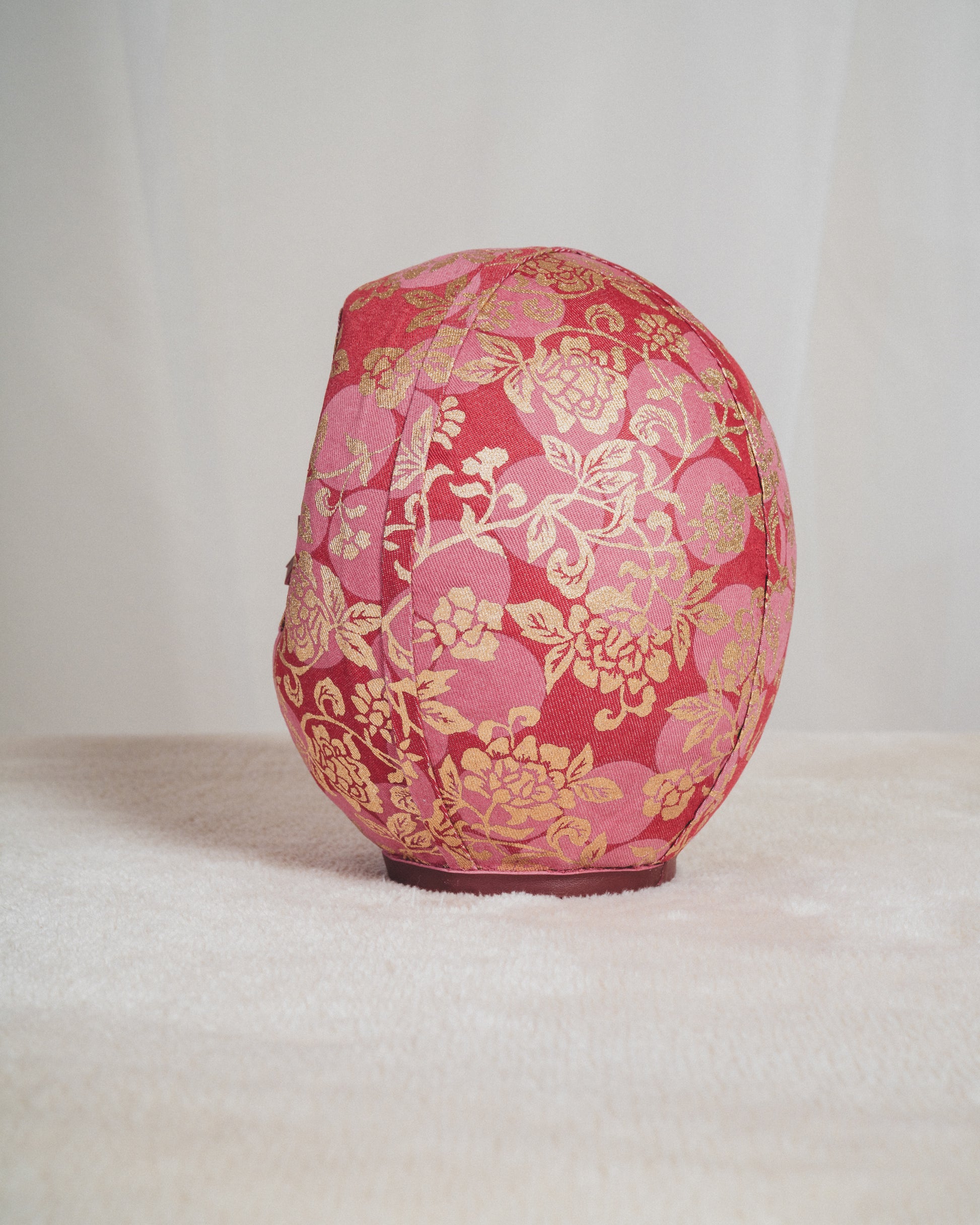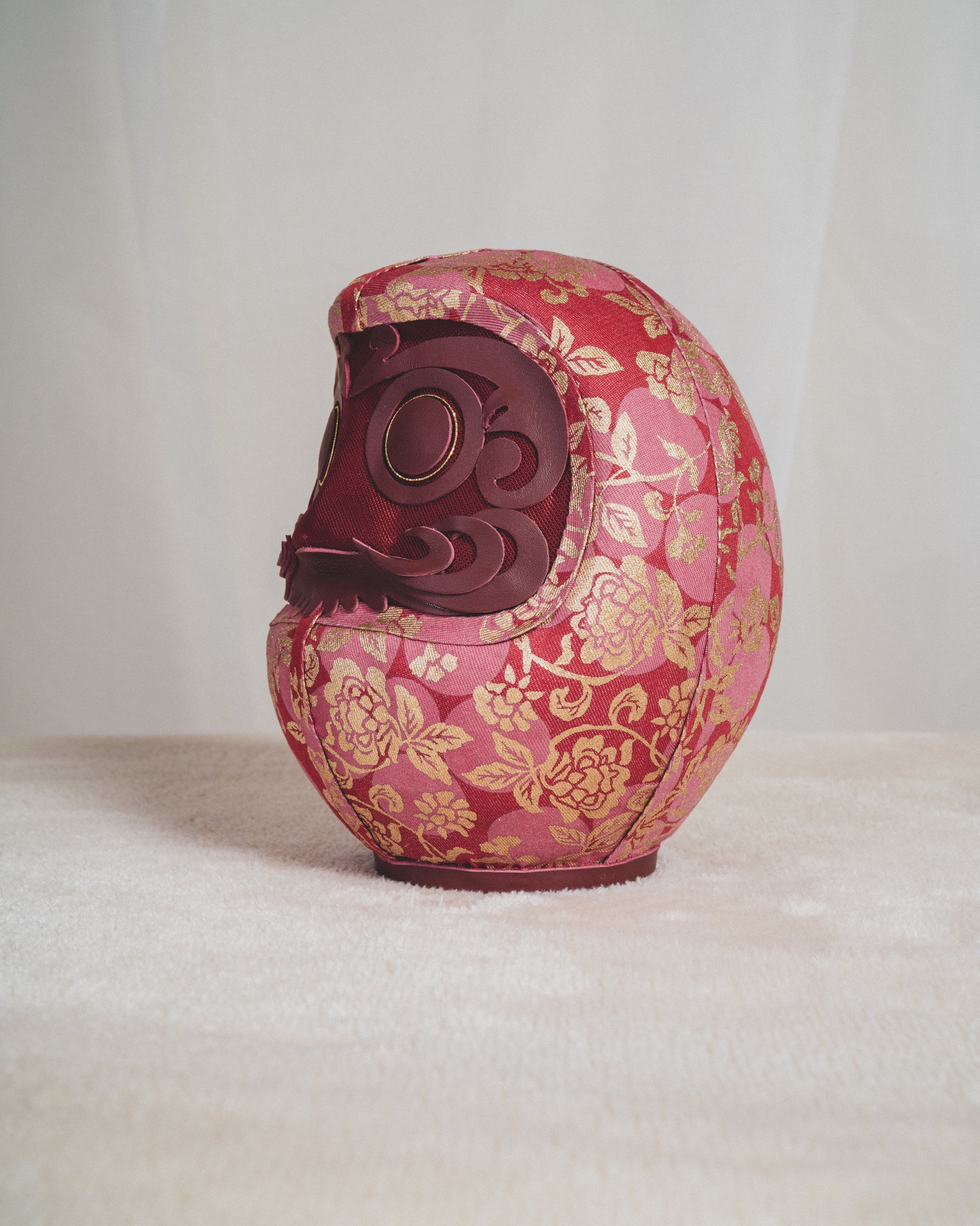 KYOTO DENIMは、着物に用いられてきた 300年以上の歴史を持つ京都の染色技術 を、デニムという現代素材に重ねることで、新たな表現を探求してきました。本作では、だるまのフォルムに金彩友禅(Kinsai Yuzen) の染色・金彩技法を施したデニム生地を使用していま。、京都の染めと金彩の文化を、現代のライフスタイルへと橋渡ししています。