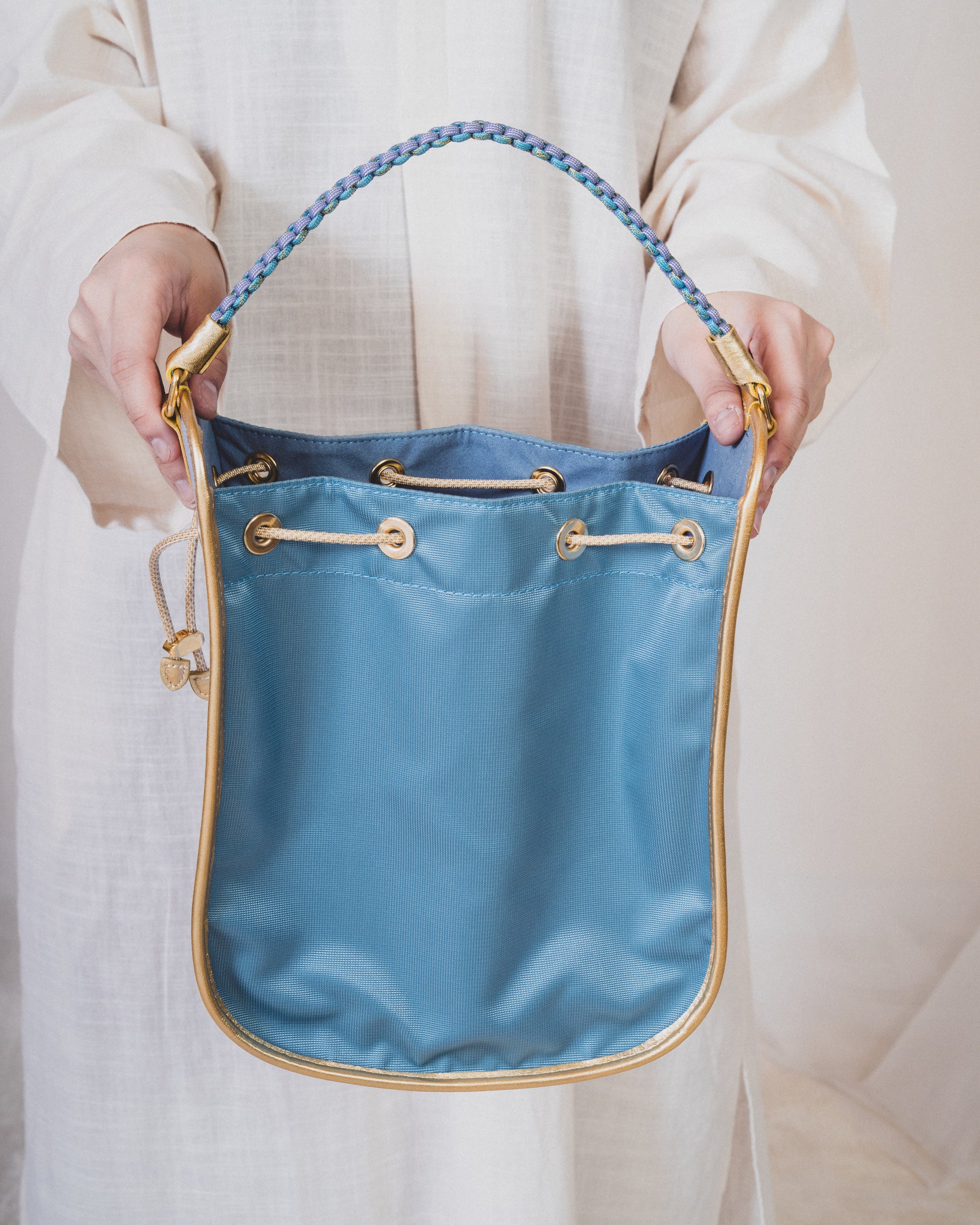 ショルダーベルトを使う際は、蝶々結びにして、開口部を巾着のようにまとめます。