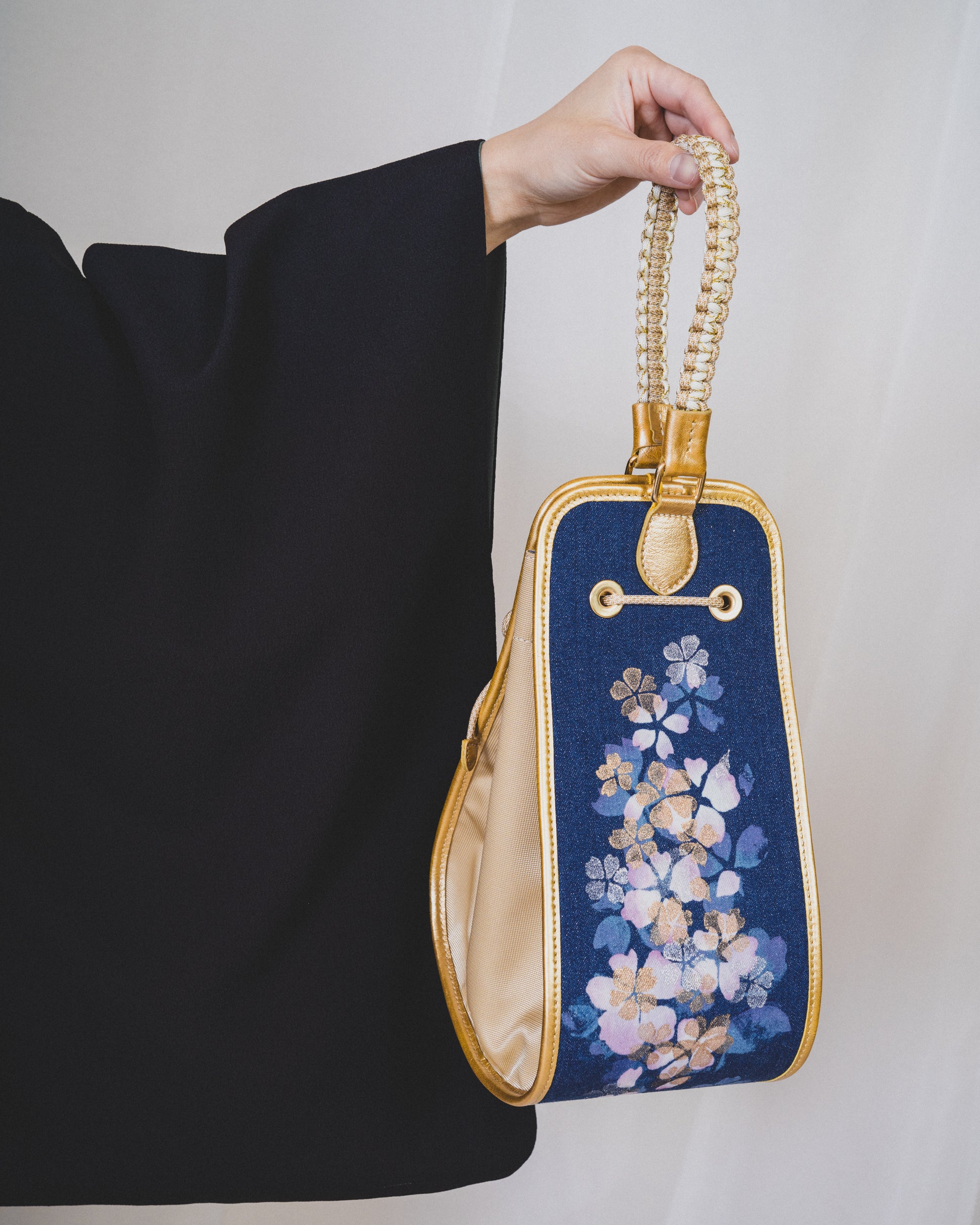 雫を表す、側面の曲線。国産デニムを側面から、底面、反対側の側面まで1枚のパーツで、職人が丁寧に包み込みました。底面も丸みを帯びながら、床に自立するかばんは、匠な職人仕事。