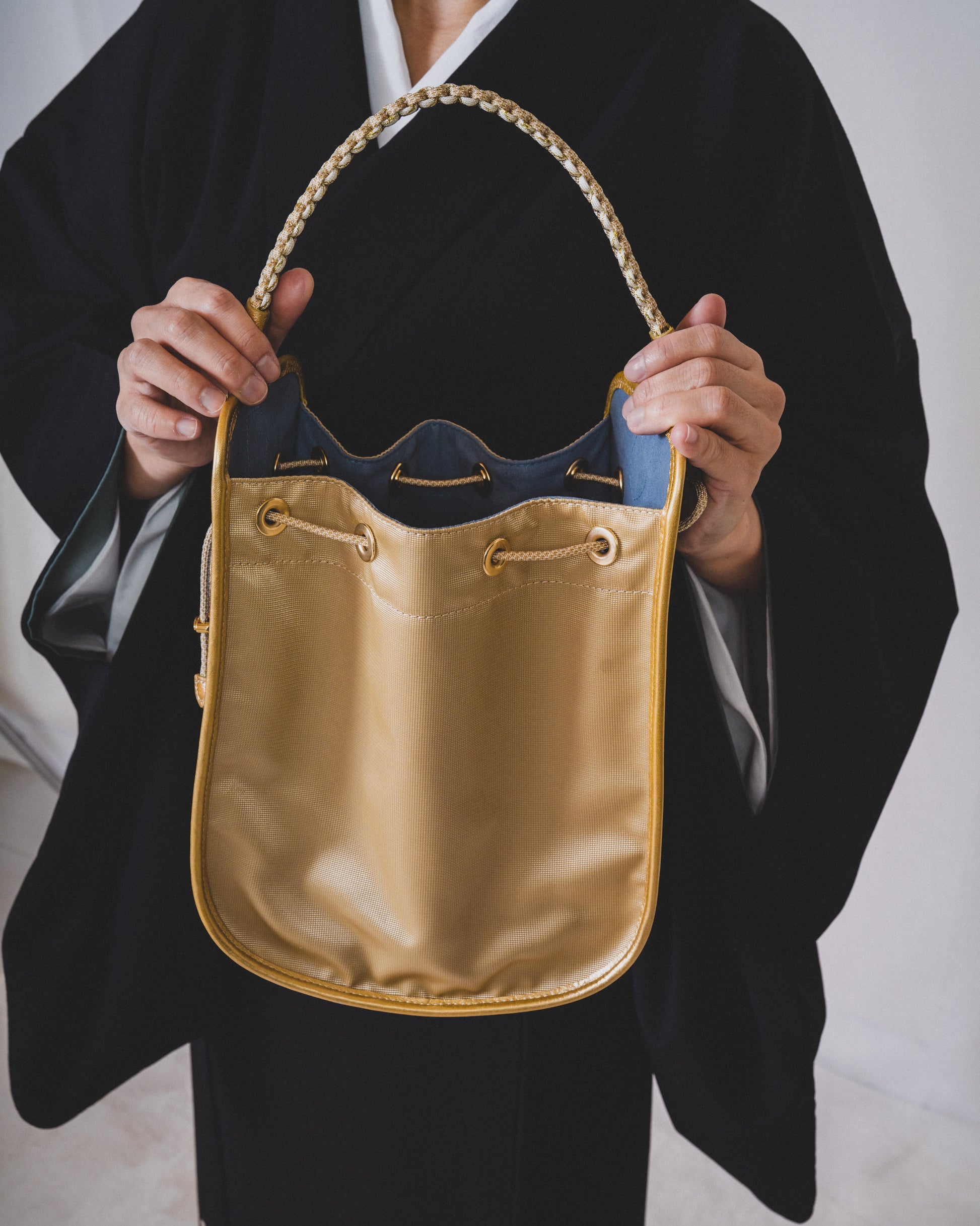 生地は、片面それぞれ太陽に照らされた雫をイメージした高級感と透明感のある淡いゴールド色のナイロン生地。肌触りが非常に滑らかで、強度がある素材です。