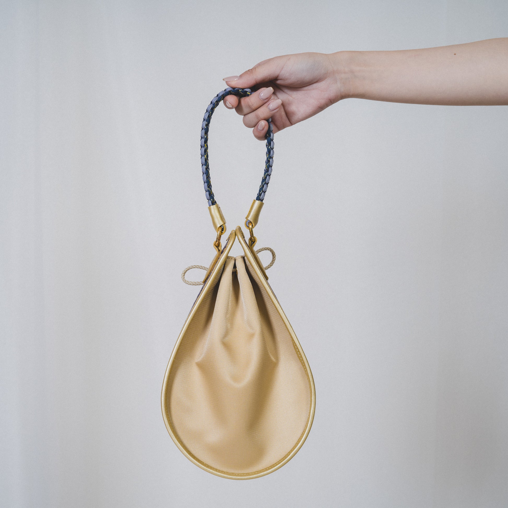 生地は、片面それぞれ太陽に照らされた雫をイメージした高級感と透明感のある淡いゴールド色のナイロン生地。肌触りが非常に滑らかで、強度がある素材です。