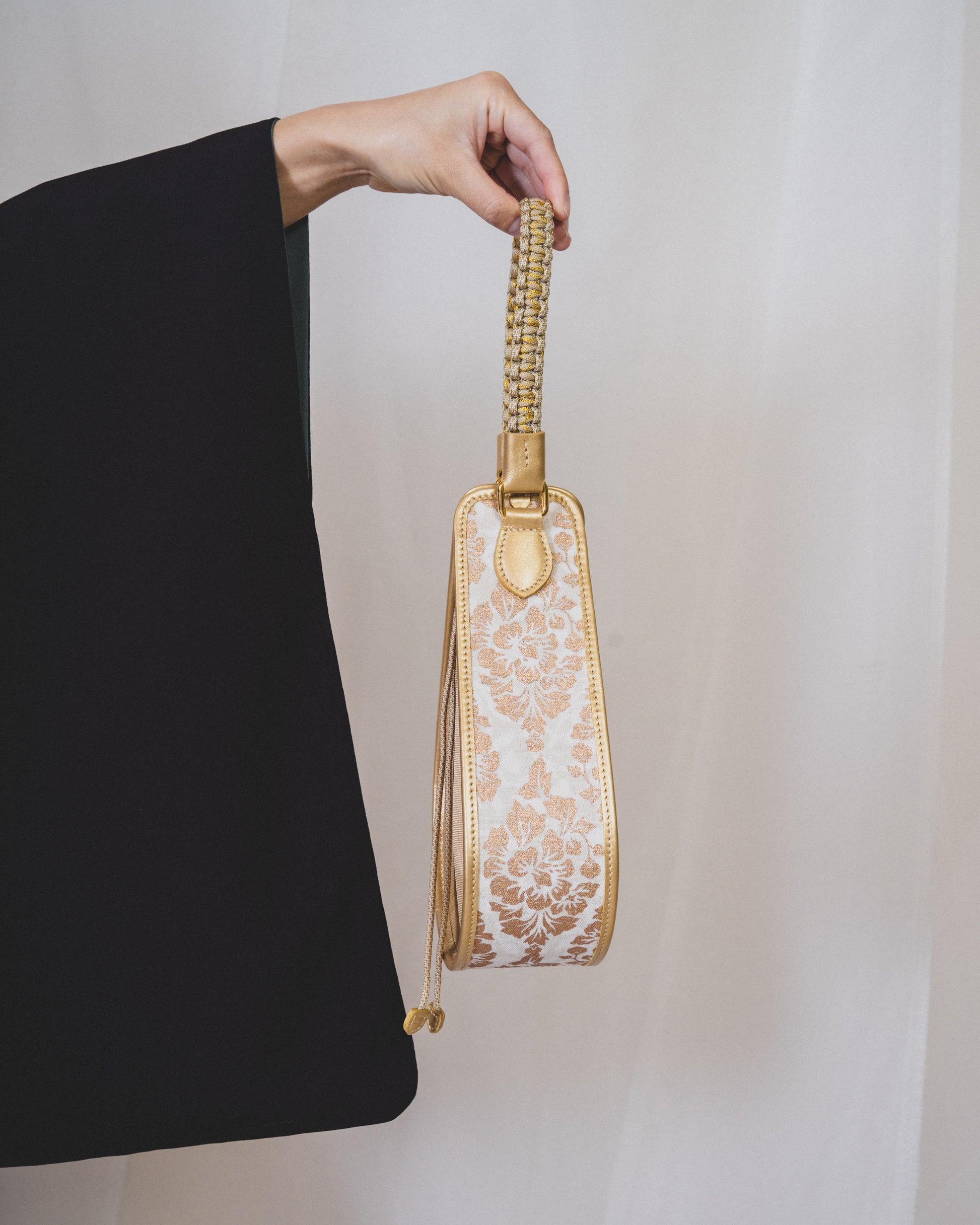 艶を抑えたゴールドの本革が、デニム素材のマチをなぞるように、優しく縁取ります。