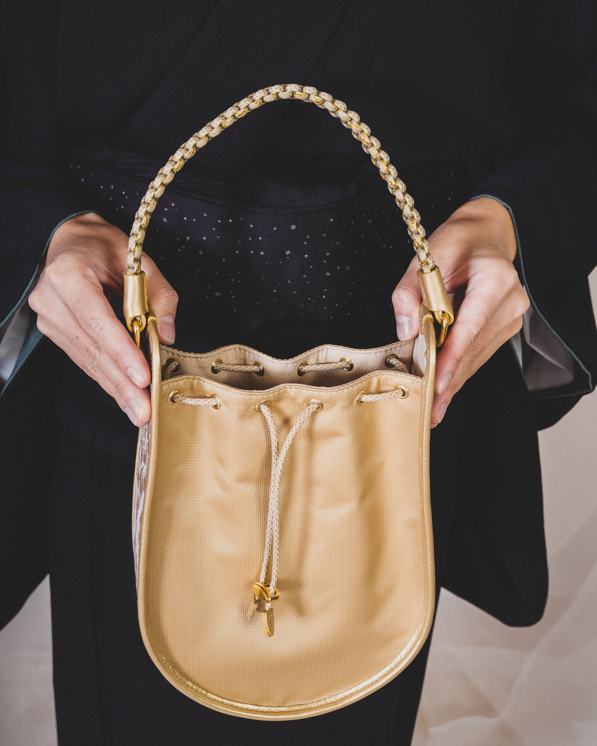 生地は、片面それぞれ太陽に照らされた雫をイメージした高級感と透明感のある淡いゴールド色のナイロン生地。肌触りが非常に滑らかで、強度がある素材です。