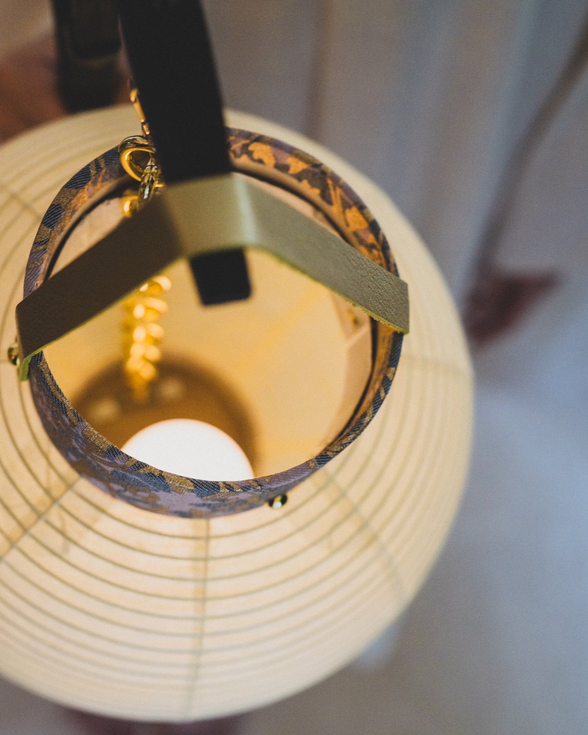 Kyoto Denim Fabric: The protective top and bottom rings of the lantern, traditionally made of wood or plain paper, are now crafted using Kyoto Denim.